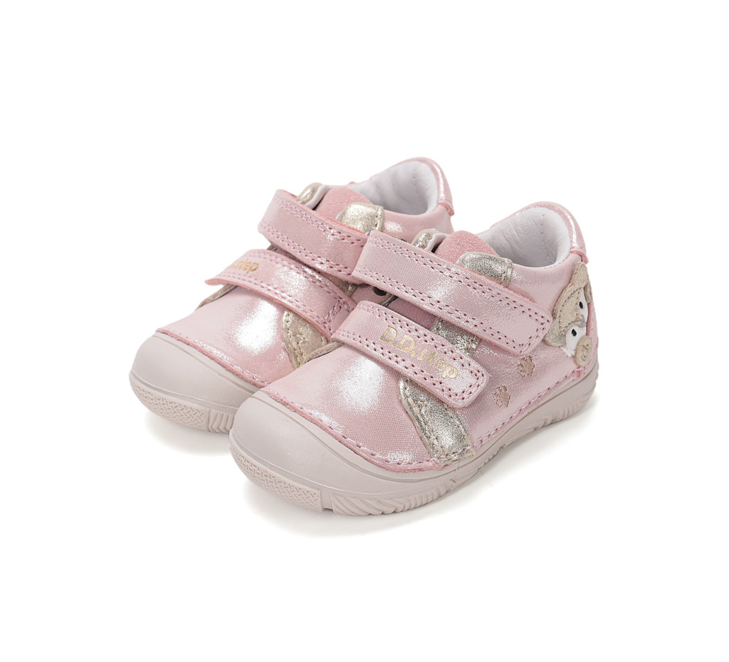 D.D. Step rókás lány zárt átmeneti cipő gyöngyrózsaszín színben, enyhén csillogó felületű. Extra cipőorr és lábujj védelem. Tépőzáras, talpbetéte kivehető, kívül-belül bőr. Vízlepergető. Elsősorban normál/széles lábfejhez ajánlott.