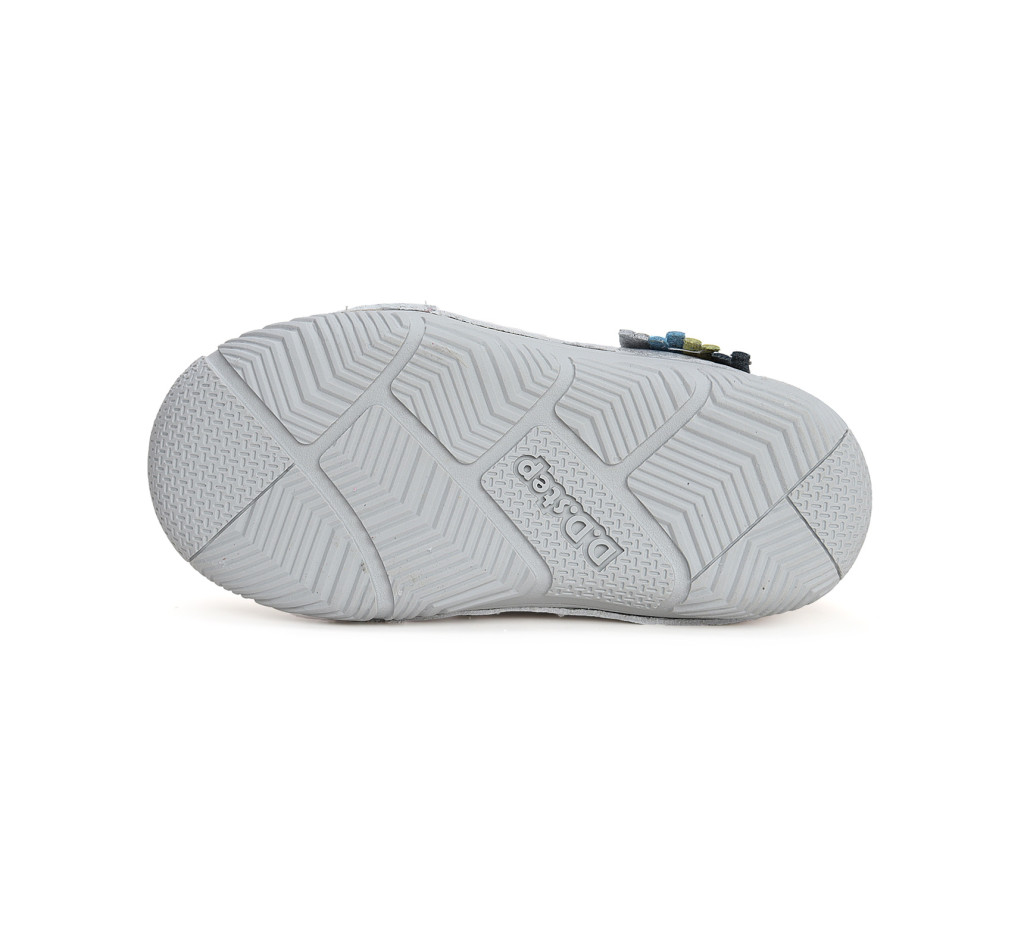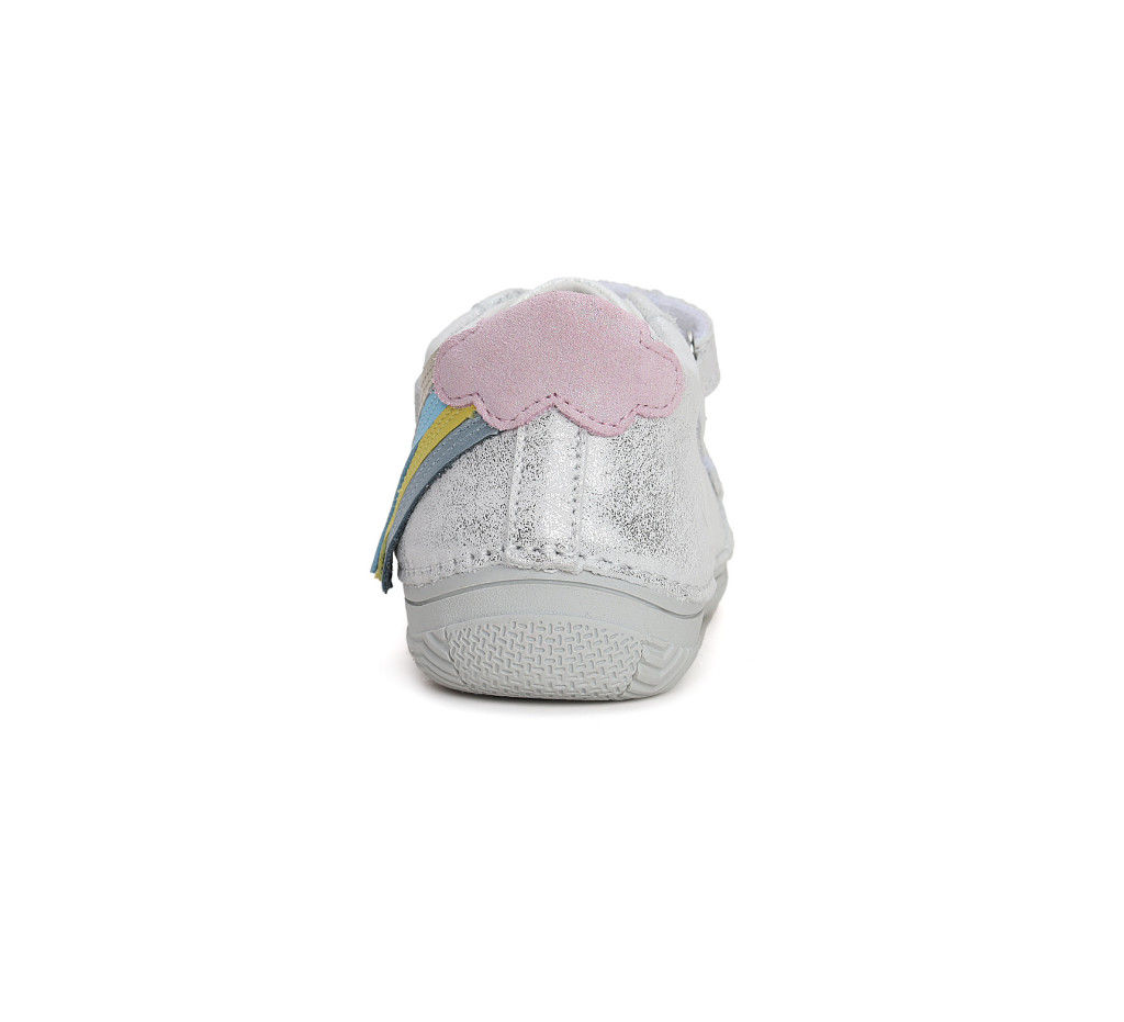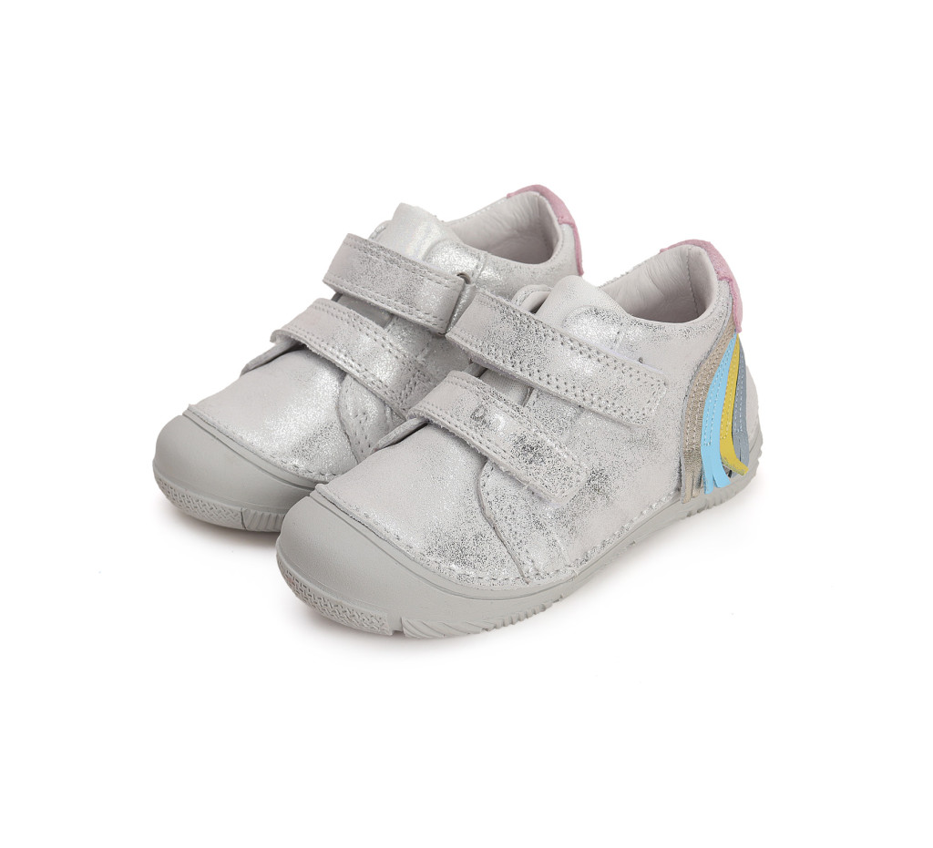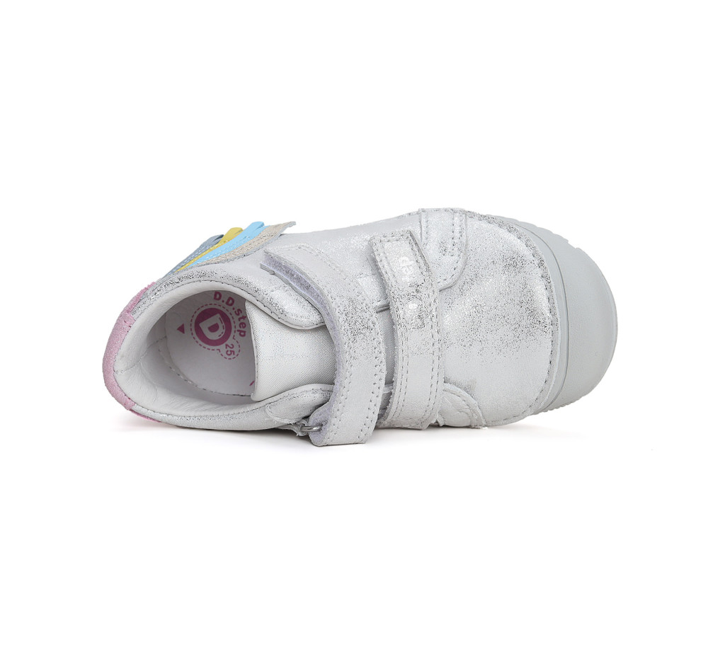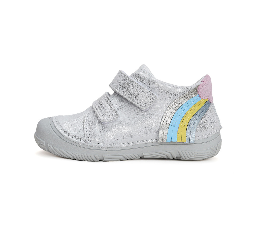 D.D. Step szivárványos lány zárt átmeneti cipő ezüst színben. Extra cipőorr és lábujj védelem. Tépőzáras. talpbetéte kivehető. kívül-belül bőr. Vízlepergető. Elsősorban normál/széles lábfejhez ajánlott.