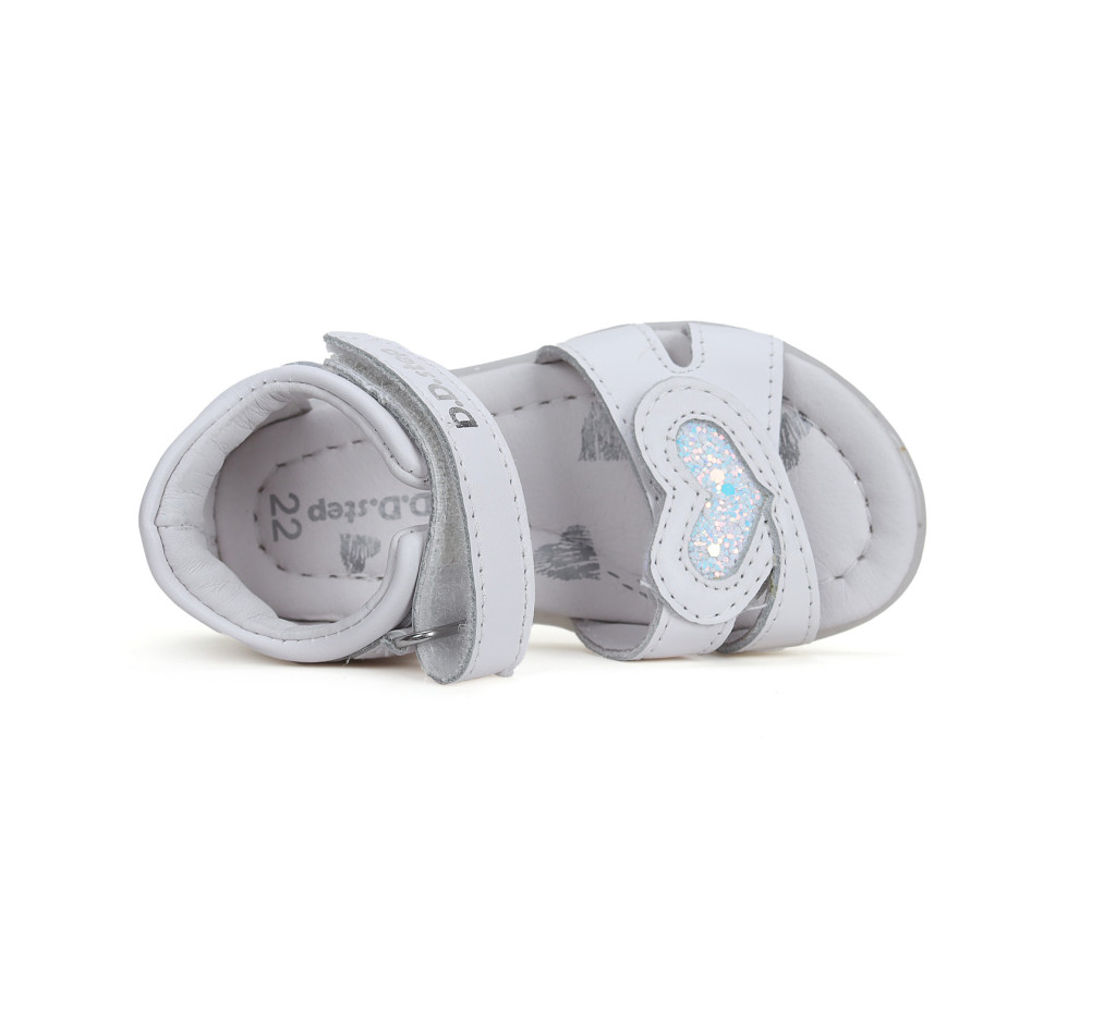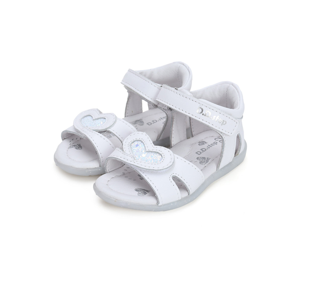 D.D. Step szivecskés lány szandál fehér színben.Tépőzáras.kívül-belül bőr.Párnázott sarokrész.Elsősorban normál/széles lábfejhez ajánlott.
