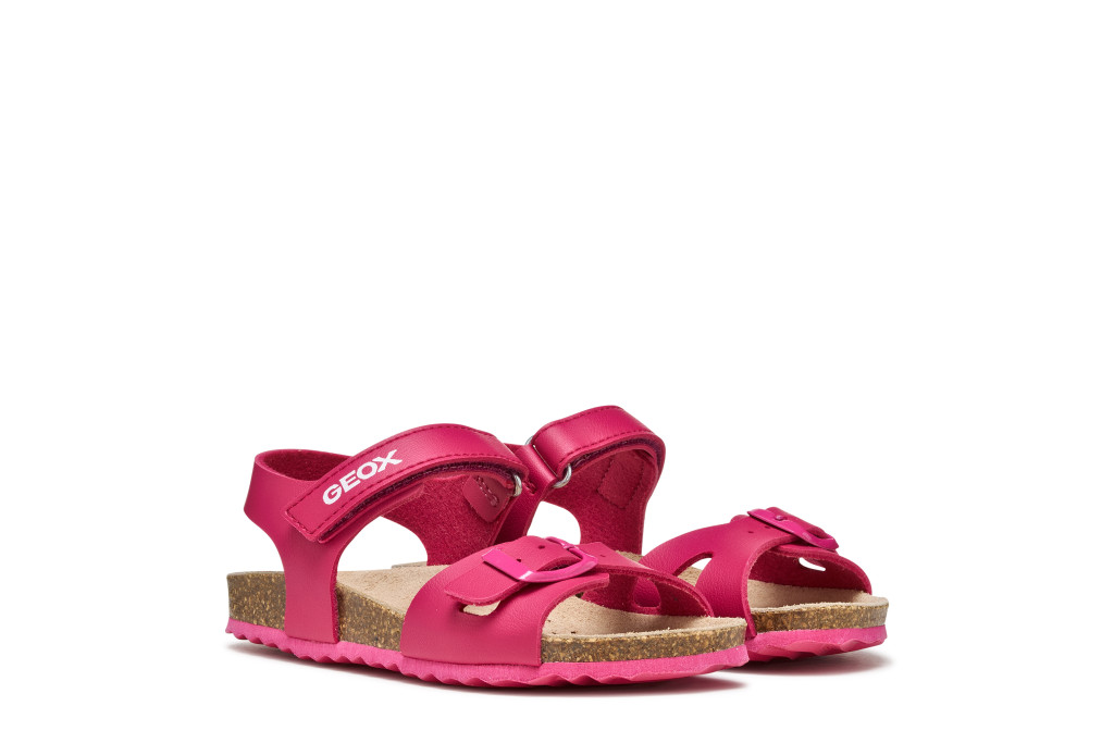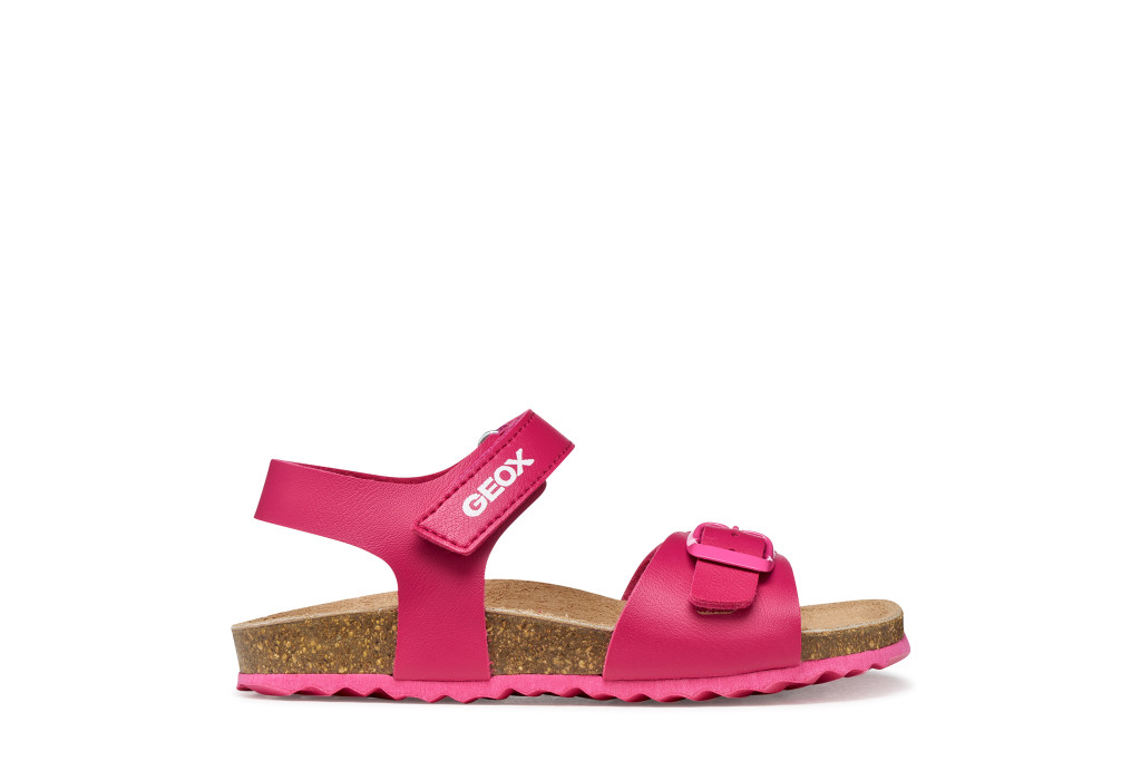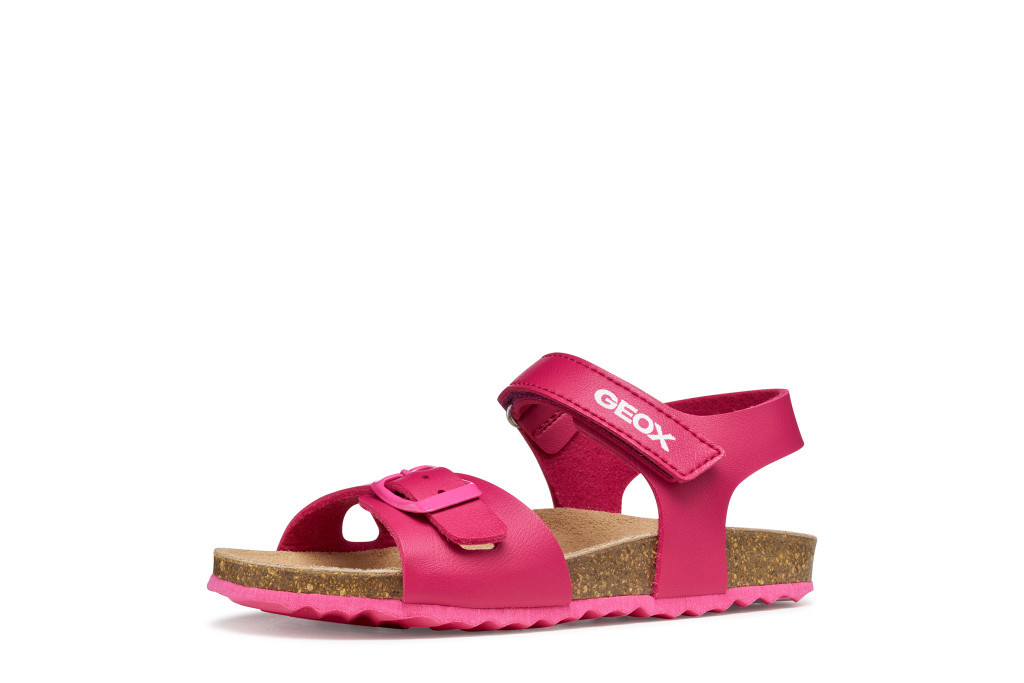 Geox lány fukszia ADRIEL sportos szandál. Anatómiailag formázott, felsőrésze bőrhatású anyagból készült, talpbetéte valódi bőr. A párnázott talp elnyeli a rezgéseket, biztosítva a kényelmet az aktív játék során. Kényelmes tépőzáras rögzítés a gyors felvételért. A Respira™ technológia garantálja a láb természetes szellőzését. Elsősorban normál lábfejhez ajánlott.