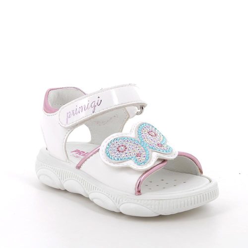 Primigi első lépés kislány szandál fehér színben, színes strasszokkal díszített pillangó mintával. Dupla tépőzárral van ellátva, a csatok, fűzőlyukak és az összes fémből készült rész nikkelmentes. A sarok párnázott, hogy maximális támaszt nyújtson a bokának. Pillekönnyű kivitel, rugalmas, csúszásmentes talp. Felső része lakkozott bőr, a bélés, a talpbetét krómmentes valódi bőrből készült. Elsősorban normál/széles lábfejhez ajánlott.
