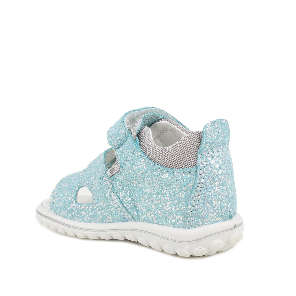Primigi első lépés kislány szandál türkiz színben, enyhén csillogó felületű. Tépőzárral és 2 csattal van ellátva, a csatok, fűzőlyukak és az összes fémből készült rész nikkelmentes. A sarok zárt, párnázott, hogy maximális támaszt nyújtson a bokának. Pillekönnyű kivitel, rugalmas, csúszásmentes talp. Felső része velúrbőr, a bélés, a talpbetét krómmentes valódi bőrből készült. Elsősorban normál/széles lábfejhez ajánlott.