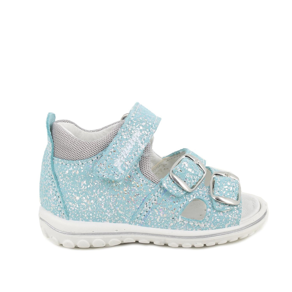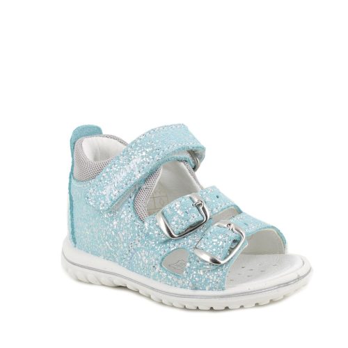 Primigi első lépés kislány szandál türkiz színben, enyhén csillogó felületű. Tépőzárral és 2 csattal van ellátva, a csatok, fűzőlyukak és az összes fémből készült rész nikkelmentes. A sarok zárt, párnázott, hogy maximális támaszt nyújtson a bokának. Pillekönnyű kivitel, rugalmas, csúszásmentes talp. Felső része velúrbőr, a bélés, a talpbetét krómmentes valódi bőrből készült. Elsősorban normál/széles lábfejhez ajánlott.