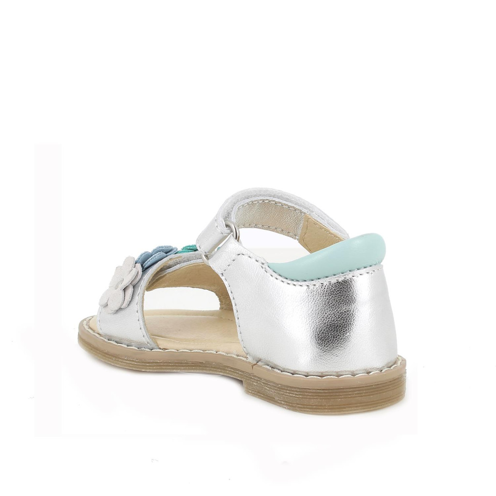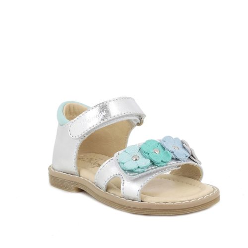 Primigi első lépés kislány szandál ezüst színben, menta színű virágokkal. Dupla tépőzárral van ellátva, a csatok, fűzőlyukak és az összes fémből készült rész nikkelmentes. A sarok zárt, párnázott, hogy maximális támaszt nyújtson a bokának. Felső része laminált valódi bőr, a bélés, a talpbetét krómmentes valódi bőrből készült. Elsősorban normál/széles lábfejhez ajánlott.