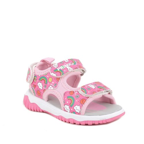 Primigi kislány szandál rózsaszín színben, vidám mintákkal. Három állítható tépőzárral rendelkezik a kényelmes illeszkedés érdekében, a csatok, fűzőlyukak és az összes fémből készült rész nikkelmentes. Felső része textil és szintetikus bőr, a bélésanyag textil, míg a talpbetét EVA-ból készült, amely egy könnyű habtalp. Elsősorban normál/széles lábfejhez ajánlott.
