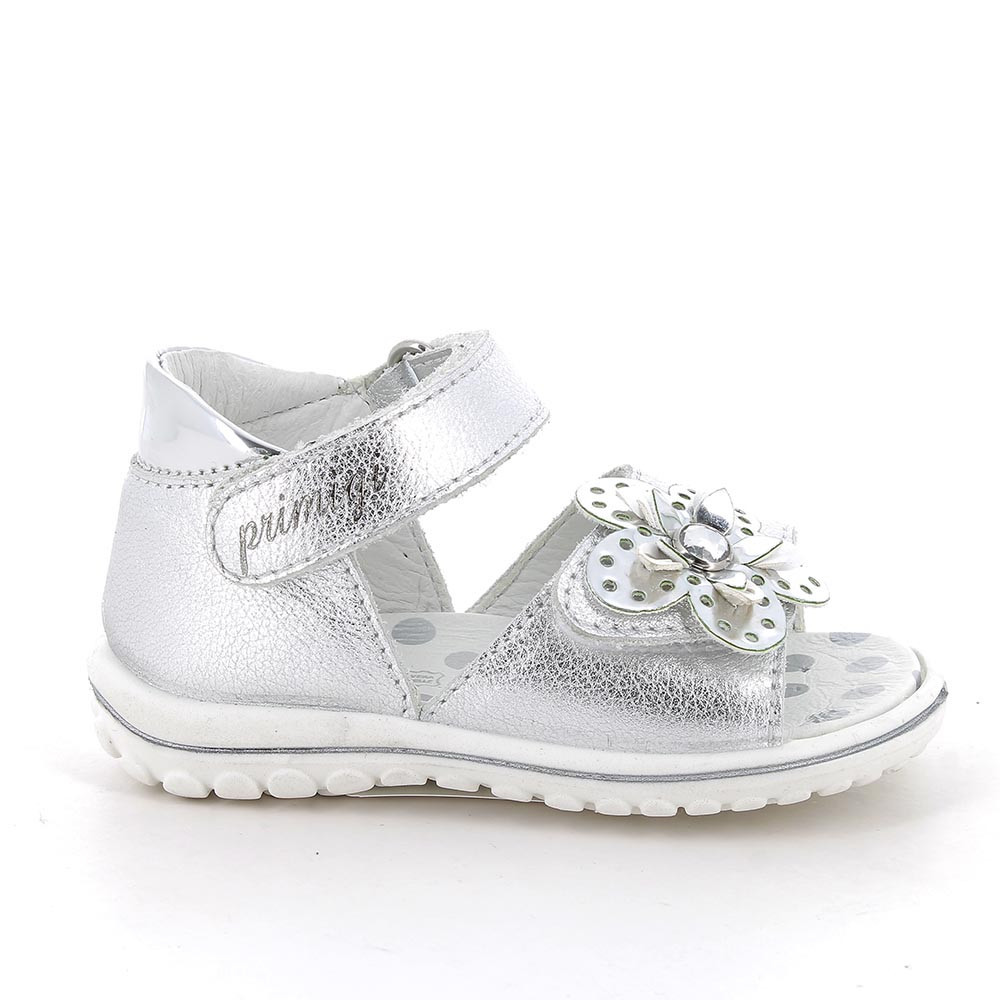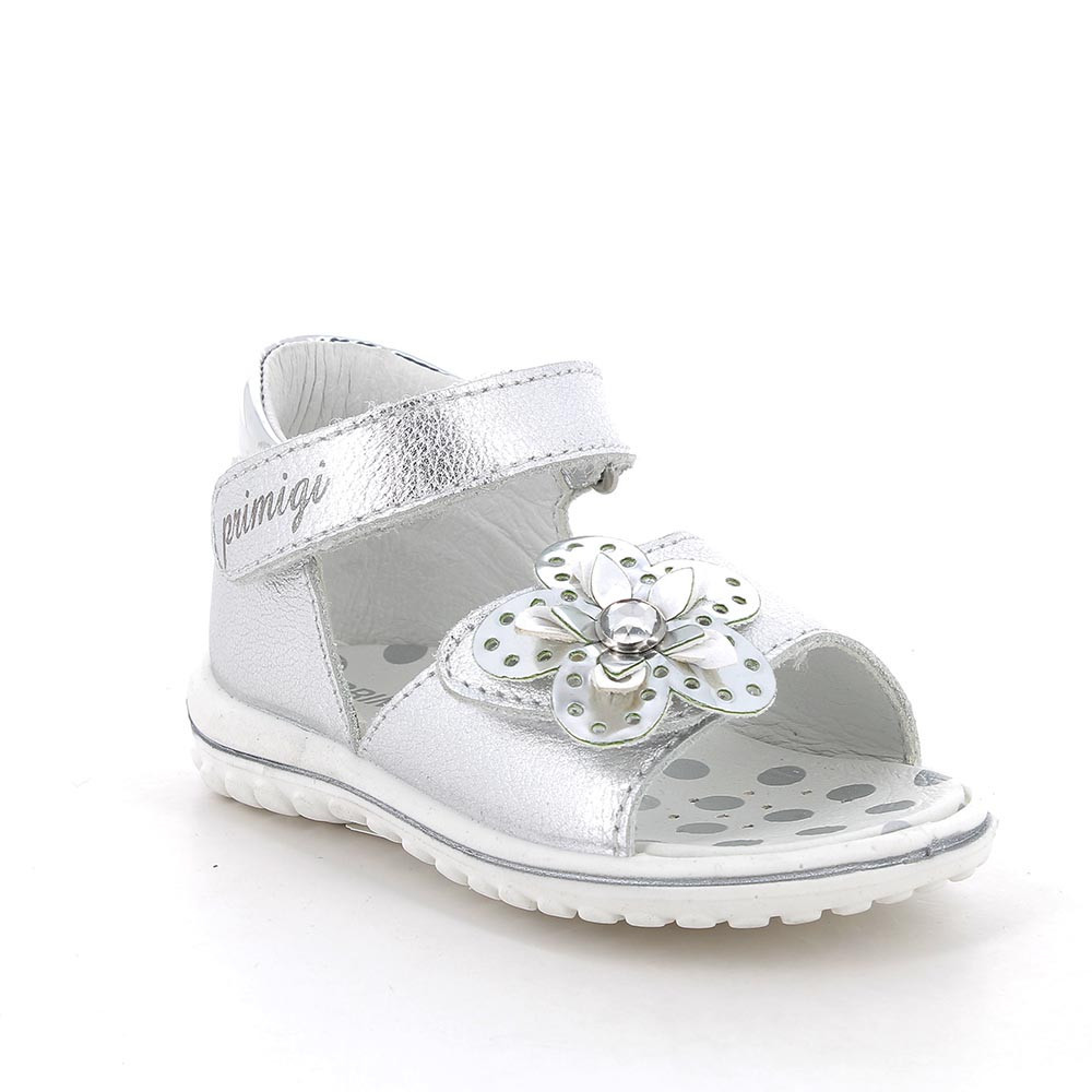 Primigi első lépés kislány szandál ezüst színben, virág mintával, enyhén csillogó felületű. Dupla tépőzárral van ellátva, a csatok, fűzőlyukak és az összes fémből készült rész nikkelmentes. A sarok zárt, párnázott, hogy maximális támaszt nyújtson a bokának. Felső része mintás, laminált valódi bőr, a bélés, a talpbetét krómmentes valódi bőrből készült. Elsősorban normál/széles lábfejhez ajánlott.
