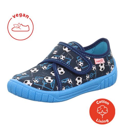 Superfit fiú foci mintás kék/többszínű BILL vászoncipő. Tartós textilből készült, strapabíró pamutbéléssel. Tépőzáras. Ultrakönnyű kivitel, rugalmas, csúszásmentes talp. A talp alsó részén található kis szellőzőnyílások pedig nagyszerű klímát biztosítanak a lábnak. Elsősorban normál lábfejhez ajánlott.