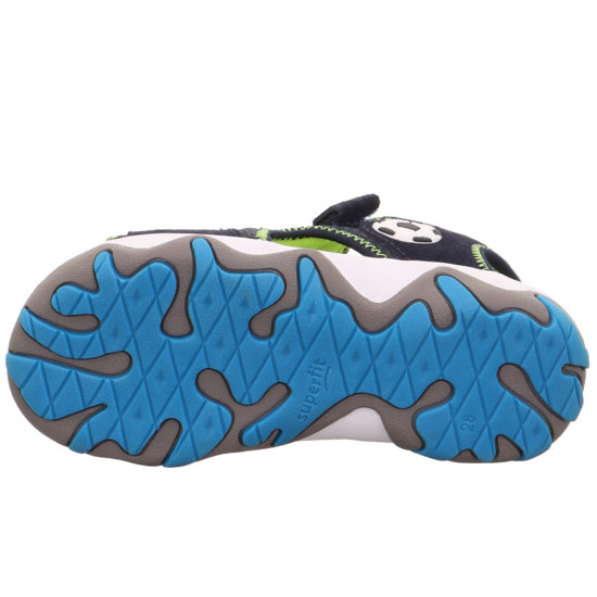 Superfit fiú kék/türkiz foci mintás MIKE 3.0 szandál. Dupla tépőzár a könnyű felvételért. Kényelmes, puha, párnázott sarokpánt. Ultrakönnyű kivitel, rugalmas, csúszásmentes talp. Felső része krómmentes velúr bőr és textil, belső bélésanyaga lélegző textil, a talpbetét krómmentes valódi bőrből készült. Elsősorban normál lábfejhez ajánlott.