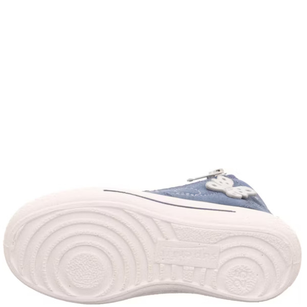 Superfit lány kék pillangós TENSY magas szárú sneakers cipő. Fűzővel és cipzárral rendelkezik a könnyű felvétel érdekében. Felső része velúr bőr és textil, bélésanyaga légáteresztő textil az ideális lábklímáért. A kivehető bőr talpbetét optimális kényelmet és jó lélegzőképességet biztosít. A sarok zárt, párnázott, hogy maximális támaszt nyújtson a bokának. Könnyű kivitel, rugalmas, csúszásmentes talp. Elsősorban normál lábfejhez ajánlott.