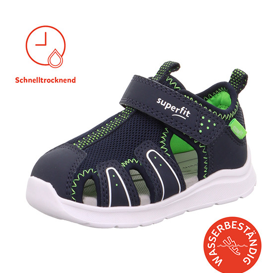 Superfit fiú kék/világoszöld WAVE szandál. Felsőrésze tartós szintetikus anyagokból, textíliából és gyorsan száradó neoprén anyagból készült, belső bélésanyaga, talpa légáteresztő textil az ideális lábklímáért. Vízálló. Nagyon könnyű, ezért viselhető vízben vagy nedvesen is, strandoláshoz kiváló, talpa csúszásmentes. Tépőzáras. Elsősorban normál lábfejhez ajánlott.