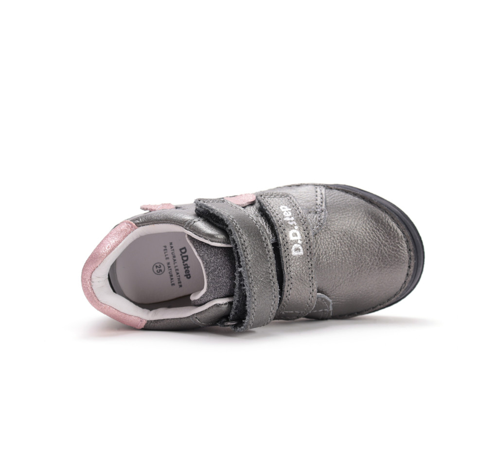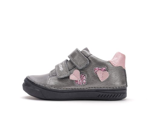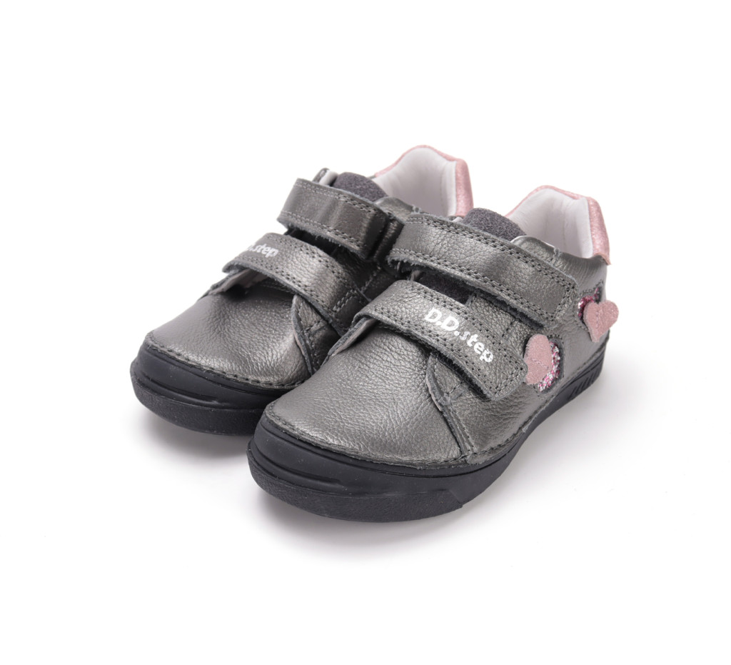 D.D.Step szivecskés zárt lány átmeneti cipő ezüst színben. Extra cipőorr és lábujj védelem. Tépőzáras. talpbetéte kivehető. Vízlepergető. Elsősorban normál/széles lábfejhez ajánlott.