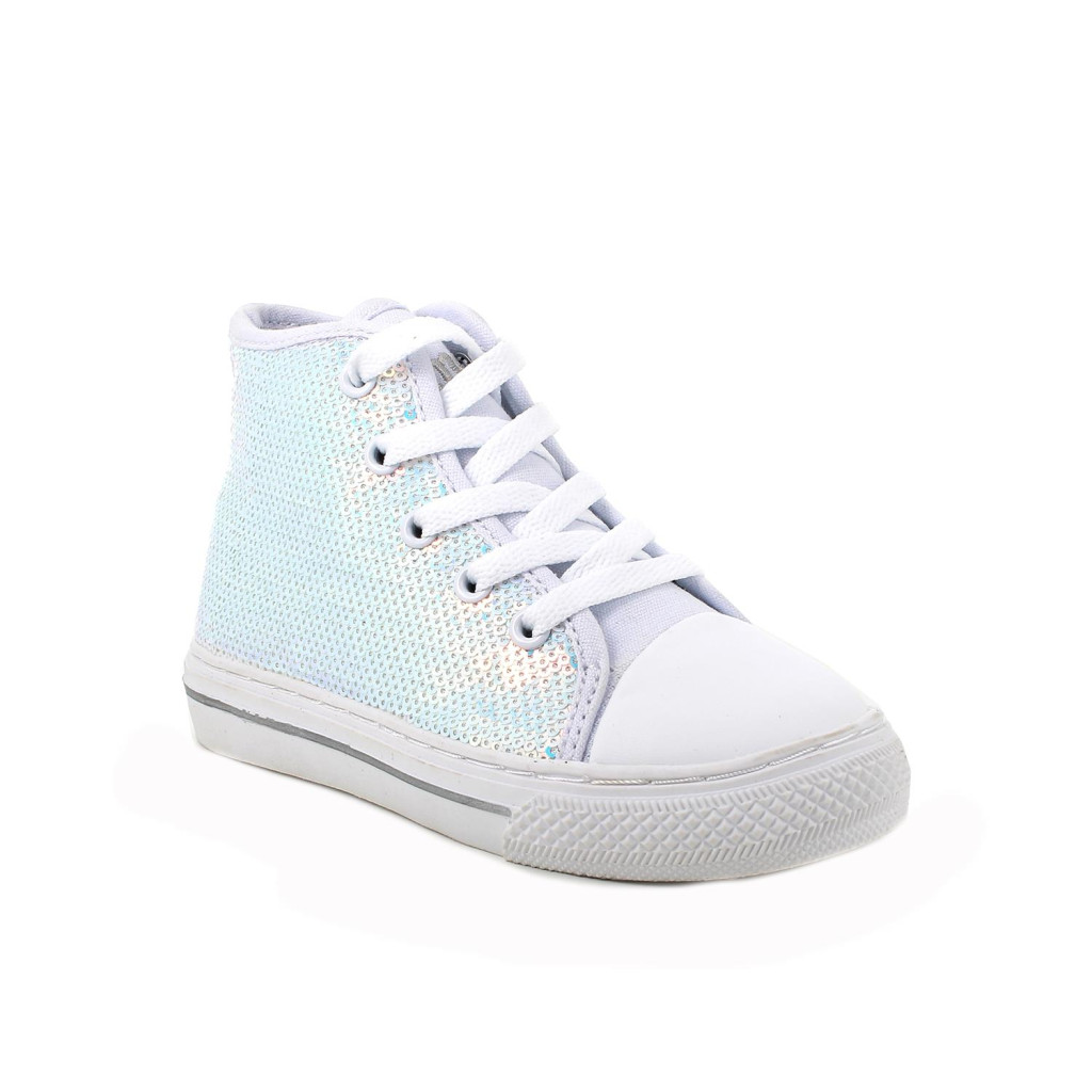 Primigi lány magas szárú szövet tornacipő, fehér színben, ezüst flitterekkel. A fűzők mellett praktikus belső cipzárral is rendelkezik a könnyű felvétel érdekében. Felső része szintetikus bőr és flitter, belső bélésanyaga textil. A kivehető bőr talpbetét optimális kényelmet és jó lélegzőképességet biztosít. Vízlepergető. Elsősorban normál/széles lábfejhez ajánlott.