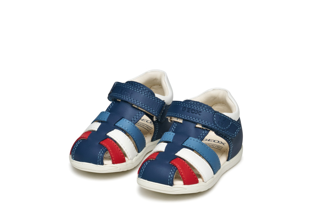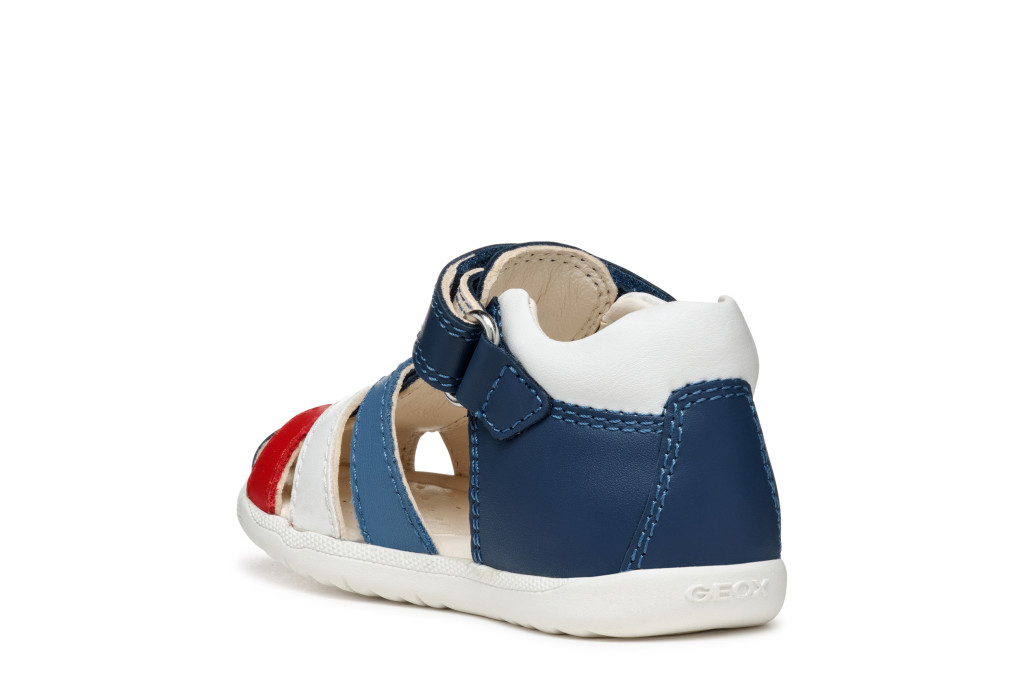 Geox fiú kék-fehér MACCHIA első lépés baba szandál, mely könnyű és légáteresztő kivitelben készült. Felsőrésze puha nappa bőr és bőrhatású felsőrész kombinációja, talpbetéte krómmentes bőr, míg a zárt orrkialakítás védi a kis lábujjakat. A rugalmas, Flexy System talpszerkezet támogatja a természetes mozgást, a stabil bokatartás pedig segíti a biztonságos járást. Tépőzáras kialakításának köszönhetően könnyen feladható és jól állítható. A Geox Respira™ technológia gondoskodik a megfelelő szellőzésről, így a cipő egész nap komfortos marad. Elsősorban normál lábfejhez ajánlott.