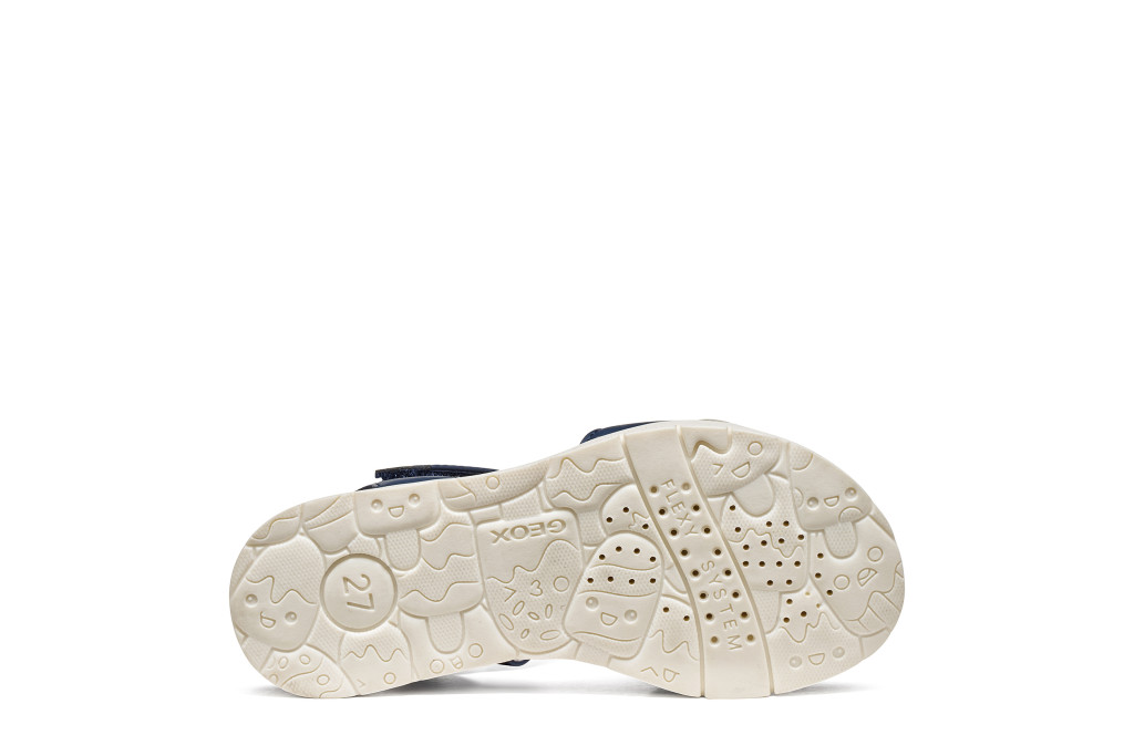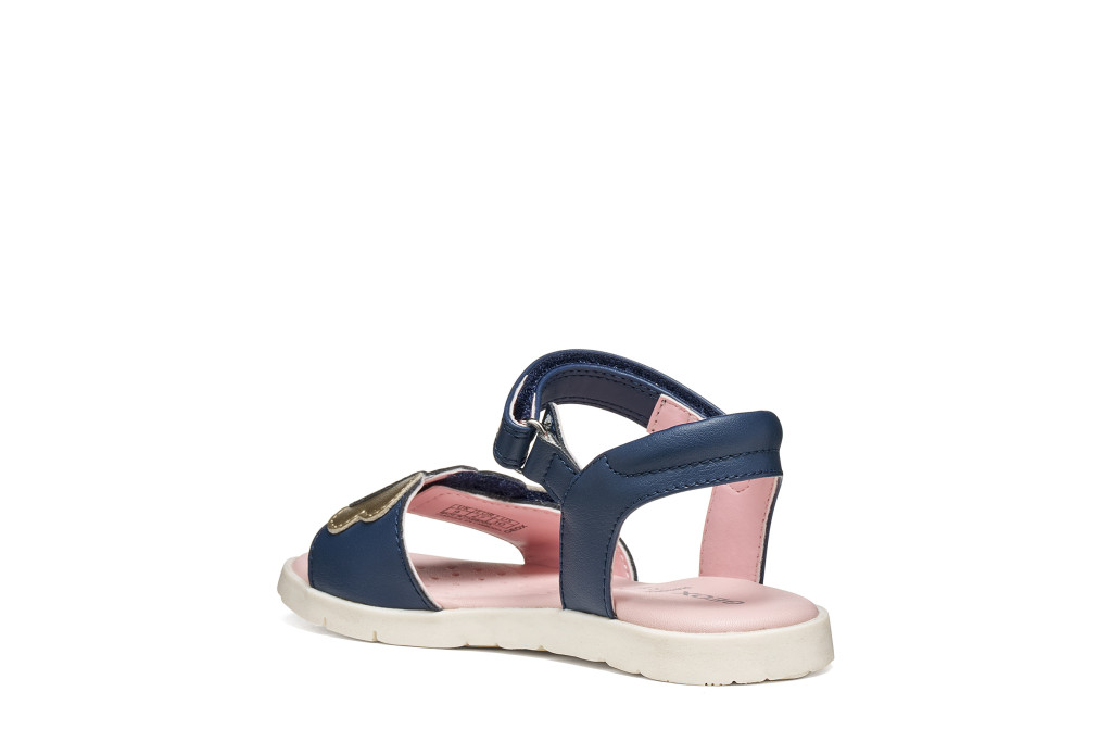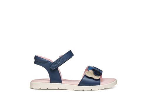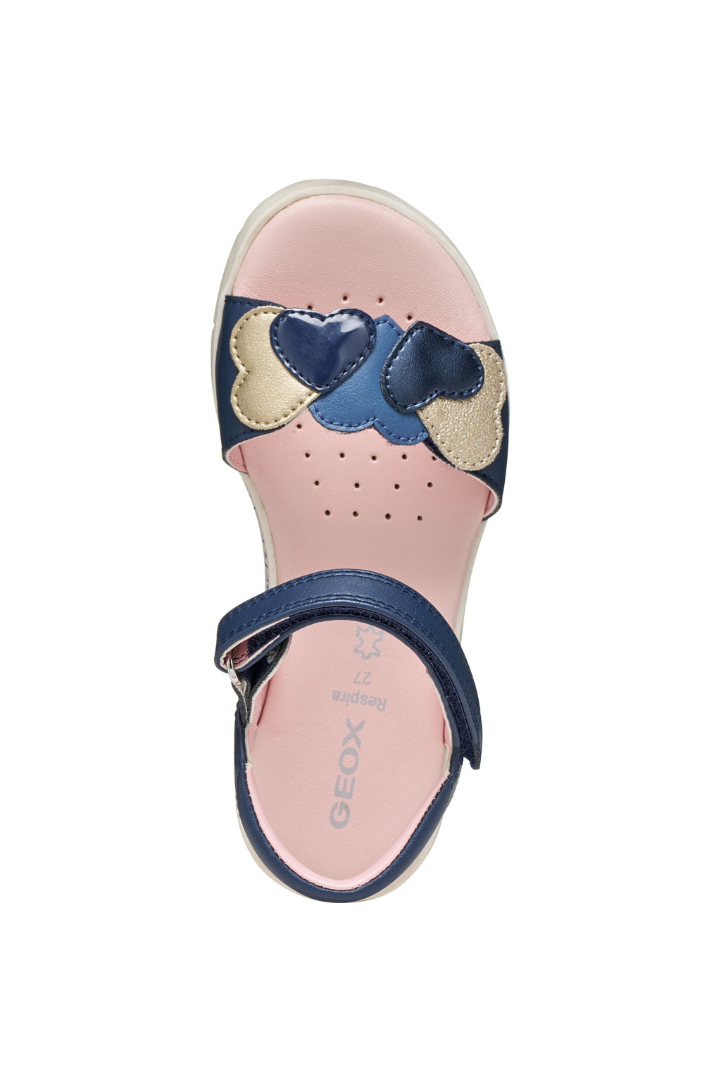 Geox lány sötétkék JOYFOOT szandál. Bőrhatású felsőrésze szívecske mintával díszített. A valódi bőr talpbetét és a textil belső rész higiénikus és puha érzetet biztosít. A nyitott orr-rész és a Respira™ technológia garantálja a lábujjak szabad mozgását és a szellőzést. Tépőzárral gyorsan a lábhoz igazítható. Elsősorban normál lábfejhez ajánlott.